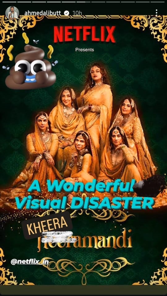 Using the medium of art to share his scathing views, Butt made not-so-subtle changes to the poster of the show, scribbling over the title so that it read “Kheeramandi”, along with the tagline “A Wonderful Visual Disaster”. In case anyone was left in doubt of his views, Butt also helpfully placed a certain brown emoji in the top left corner to make his feelings crystal clear.