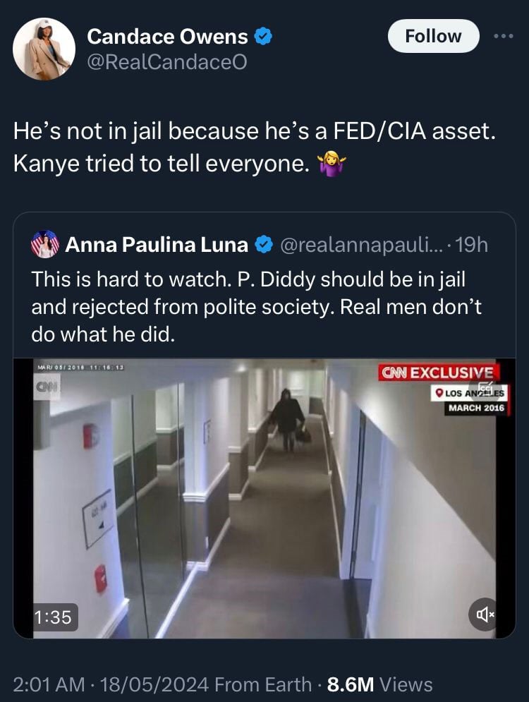 “He’s not in jail because he’s a FED/CIA asset,” she wrote. “Kanye tried to tell everyone.”