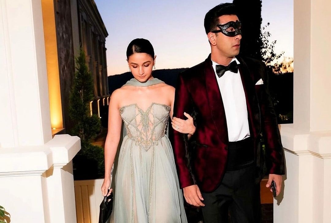 The pictures were posted to the fashion label’s Instagram grid in which Ranbir can be seen escorting Alia with a suave demeanour, like a perfect gentleman in Manan’s tuxedo. The jacket, a rich burgundy velvet, features a subtle sheen that adds a layer of opulence. The colour choice is bold yet refined, offering a refreshing departure from traditional black-tie attire. With the jacket’s cut tailored to perfection, the ensemble highlights Ranbir’s athletic frame, complemented by structured shoulders and a slim fit.